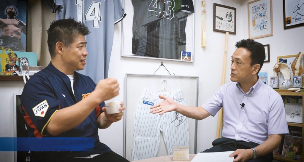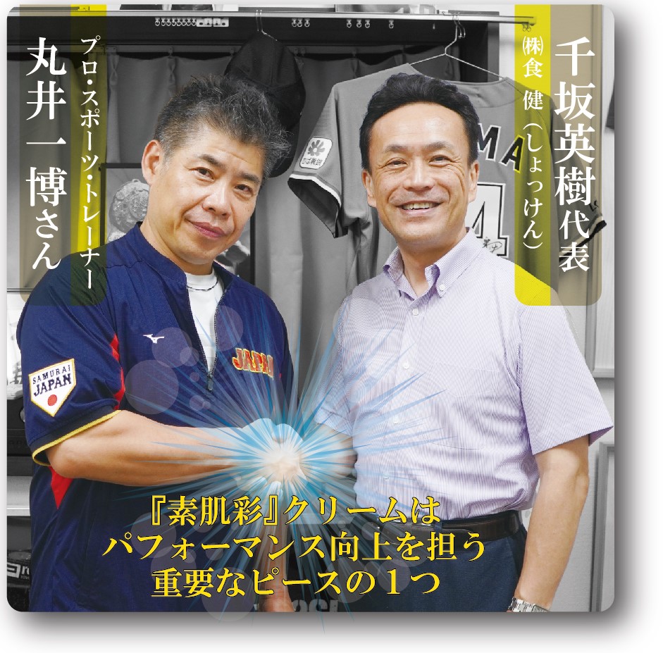 2023年春に日本代表チームが世界一の栄光に輝いた野球の国際大会のオフィシャル・トレーナーを4大会連続で務めるほか、野球、サッカー、オリンピック選手、格闘家など、プロのアスリートを含め、“日本で一番患者さんを施術している現役トレーナー”の丸井一博さんと千坂英樹代表(㈱食 健/素肌彩クリームの製造・販売会社)との対談が実現しました(取材は2023年8月1日に実施)。
