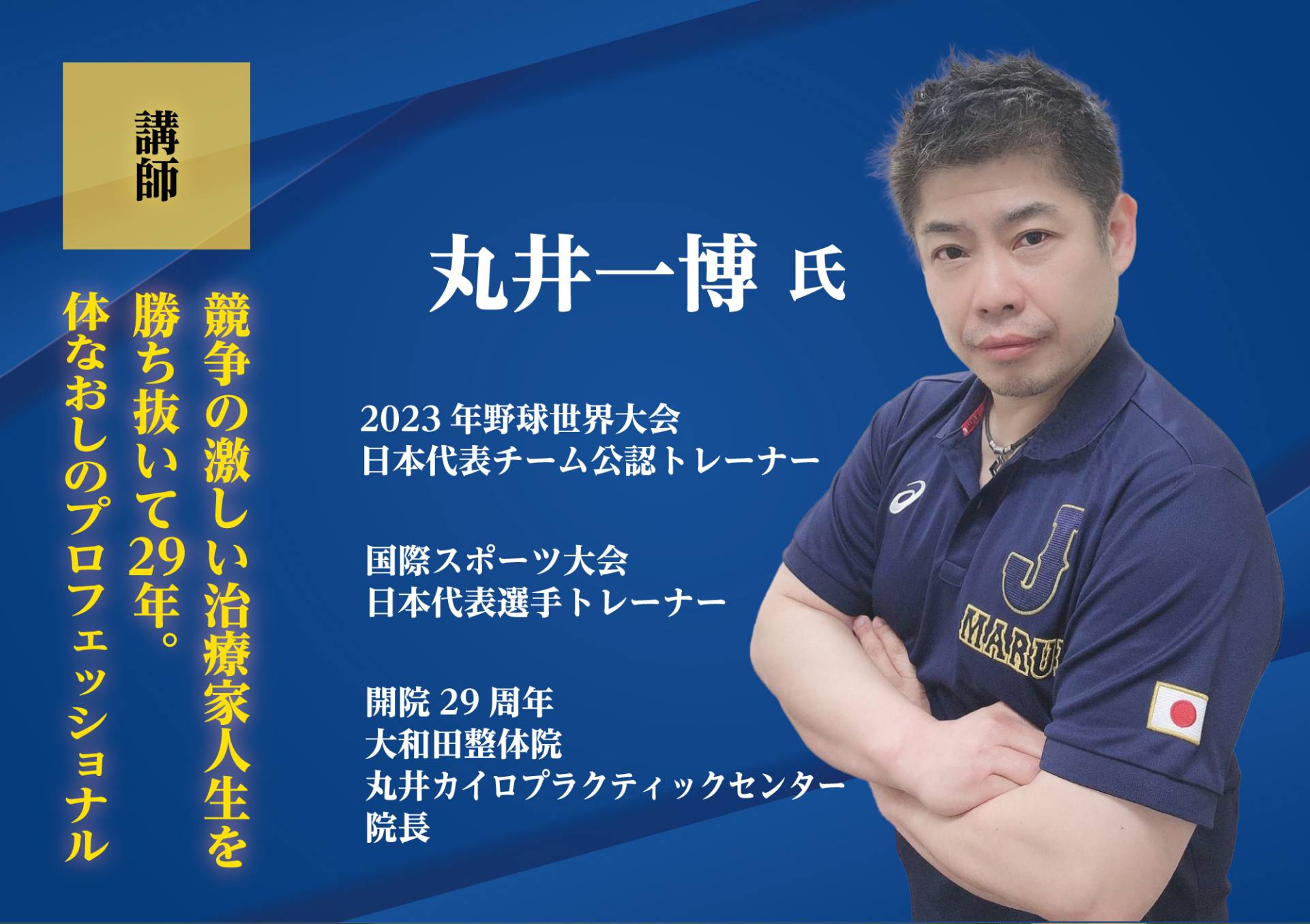 大和田整体院 丸井カイロプラクティックセンター院長/野球国際大会 日本代表トレーナー(2009/2013/2017/2023)/プロ野球チーム専属トレーナー/心と身体プロジェクト代表/プロスポーツトレーナー/加圧トレーナー/体幹コーディネーター/スポーツメンタルトレーナー/スポーツフードアドバイザー/パーソナルトレーナー/薬膳インストラクター