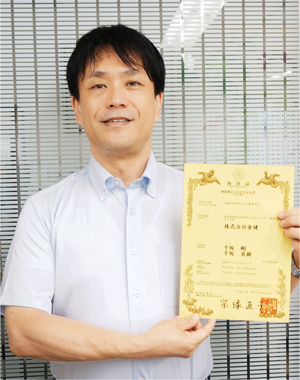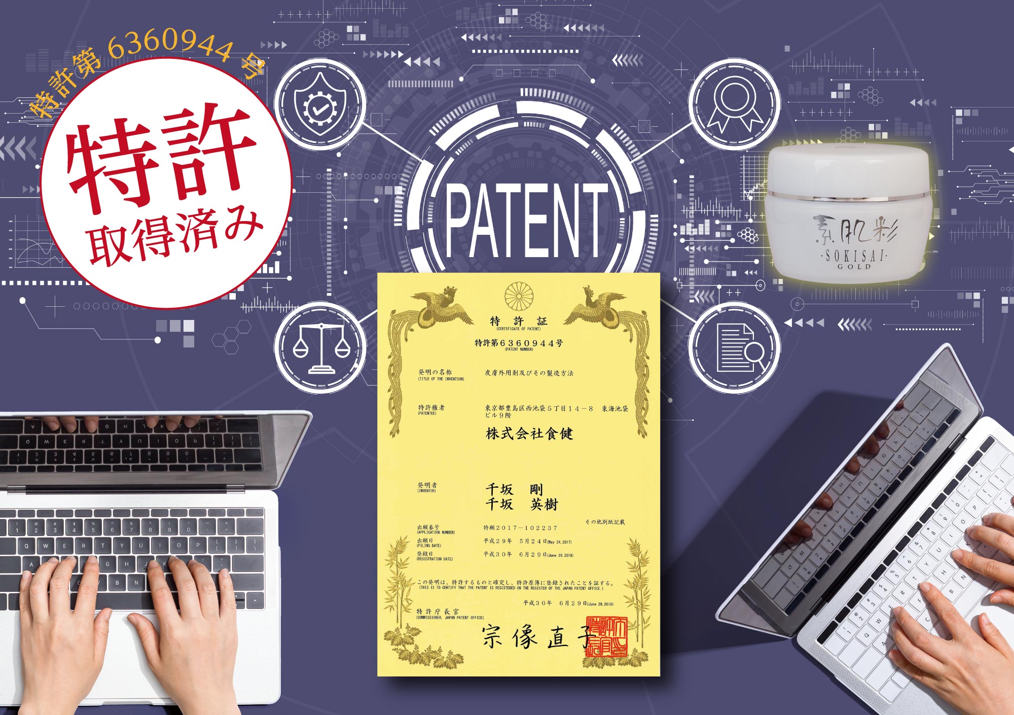 食健は、2017年5月に『素肌彩(そきさい)』クリームの特許を申請。翌2018年6月29日付で、特許庁が申請内容を承認し、発明品の一つとして登録した旨弊社に通達がありました(特許第6360944号)。つまり、『素肌彩』クリームは、食健だけが製造・販売している他社がまねできないクリームなのです。